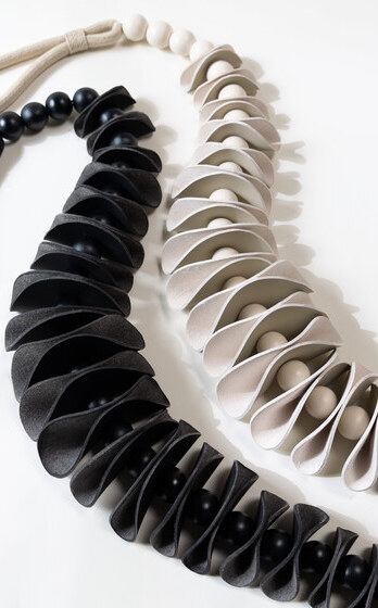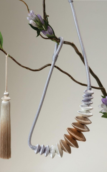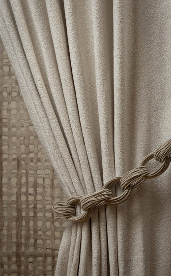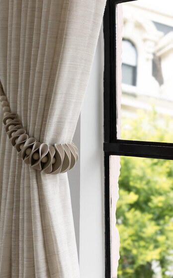 В коллекции подхватов для штор Acrobatics, разработанной Лори Вайцнер, артистизм сосуществует с конструктивностью, веселье с элегантностью. Неожиданно закрученные формы и нестандартные сочетания материалов создают приковывающий внимание эффект объёма. В том, что цветовая гамма коллекции обусловлена природой самих материалов, есть какая-то особая внутренняя утончённость.